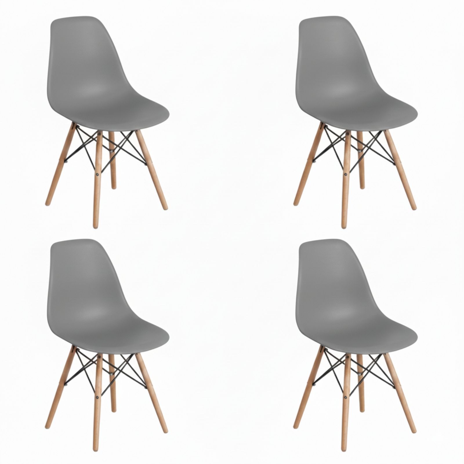 Pack de 4 sillas nórdicas DASCK grises de estilo escandinavo. Patas de madera de haya natural, tensores metálicos y asiento en polipropileno ergonómico. Carga máxima 120 kg por silla. Incluye tornillería y manual de montaje.
