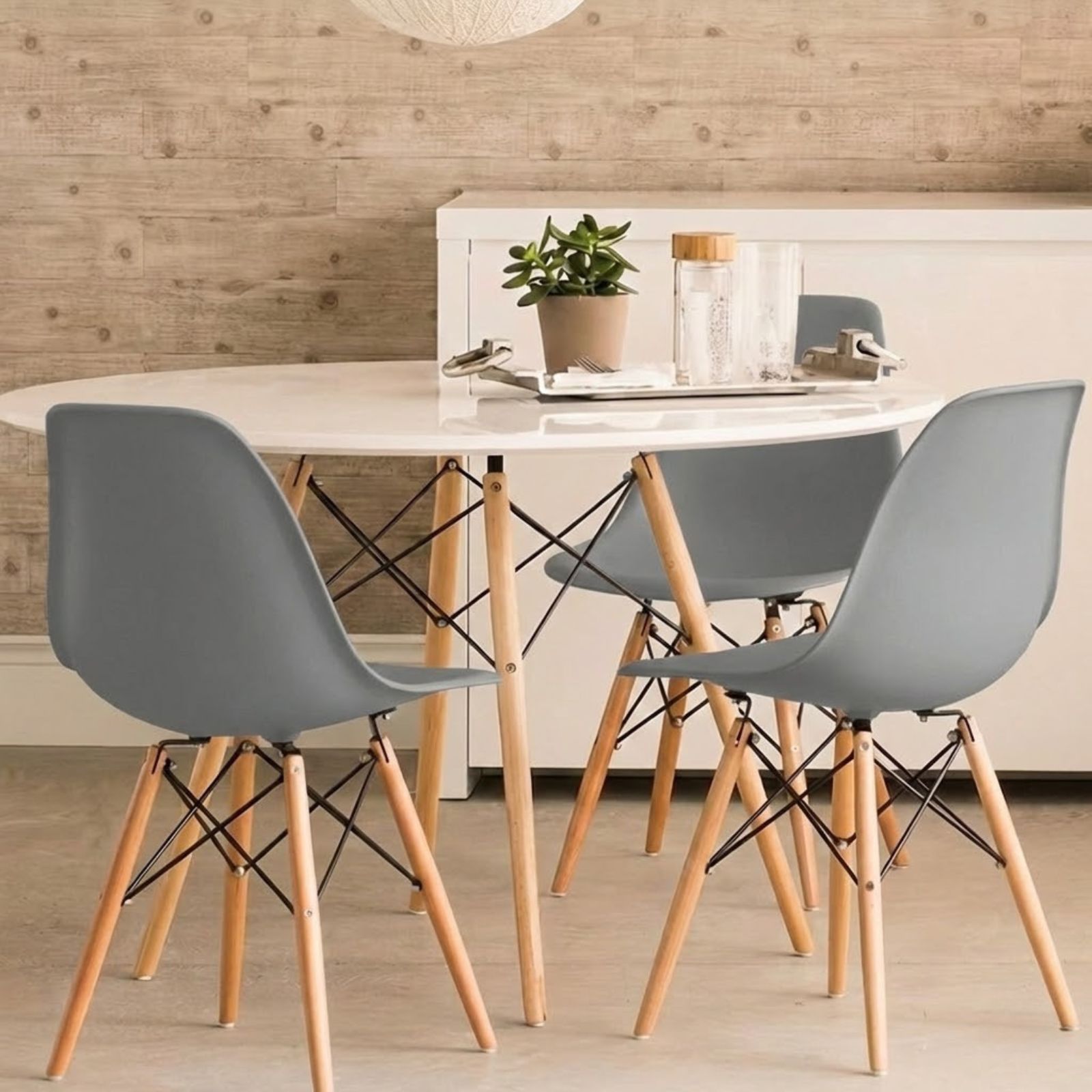 Incluye 4 sillas nórdicas DASCK grises idénticas. Perfecto para mesas de 4 comensales. Embaladas conjuntamente, montaje independiente con tornillería y manual incluidos en cada caja.