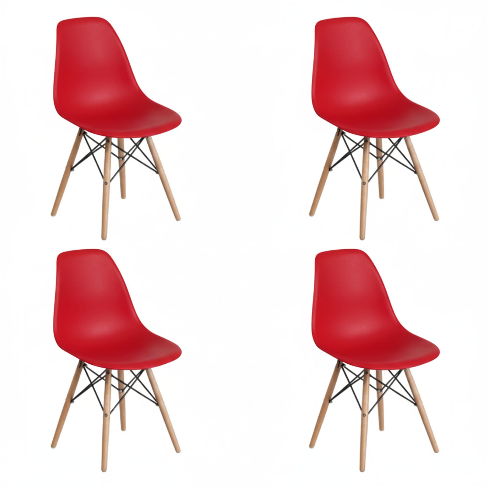 Pack de 4 sillas nórdicas DASCK rojas de estilo escandinavo. Patas de madera de haya natural, tensores metálicos y asiento en polipropileno ergonómico. Carga máxima 120 kg por silla. Incluye tornillería y manual de montaje.