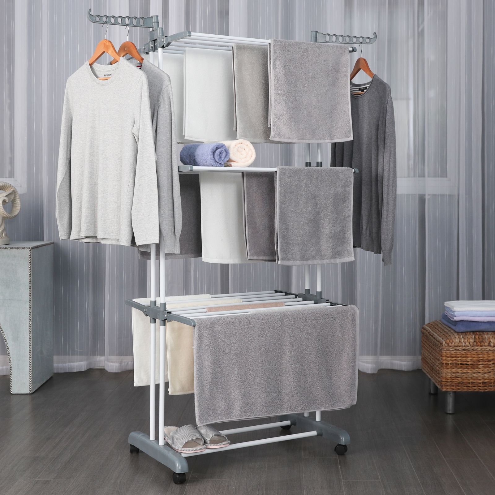 Aprovecha la altura en lugar del suelo. Los 3 niveles permiten tender sabanas arriba, camisas en el medio y ropa interior abajo.